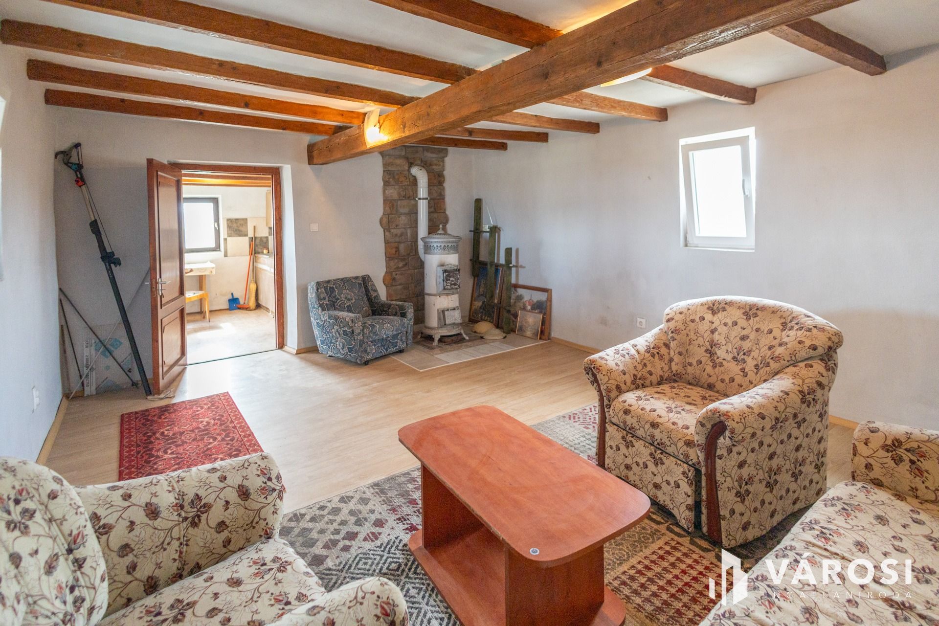 -Lakóépület (33,27 m²): szoba, konyha, fürdőszoba, fatüzelésű kályhás fűtéssel