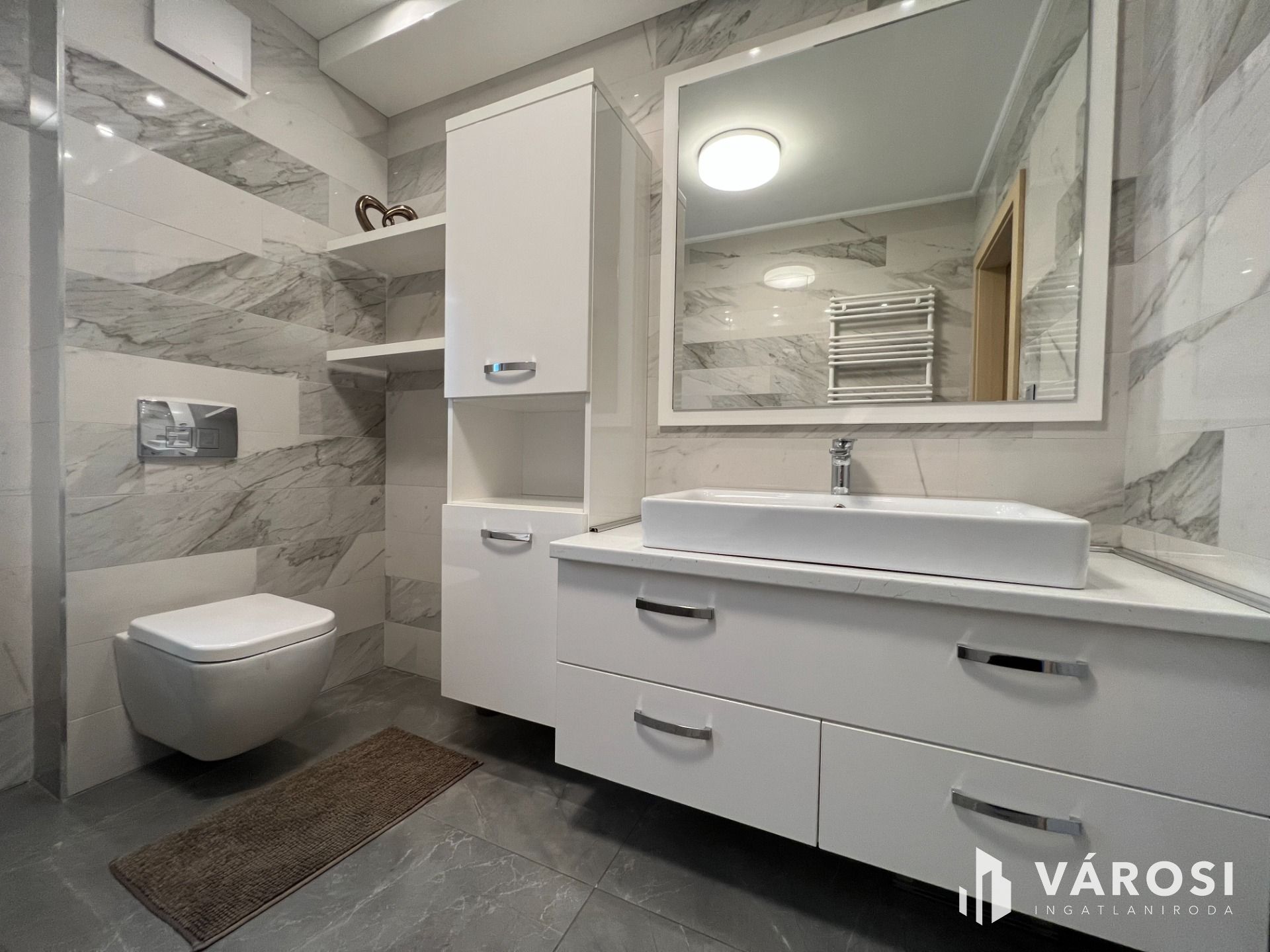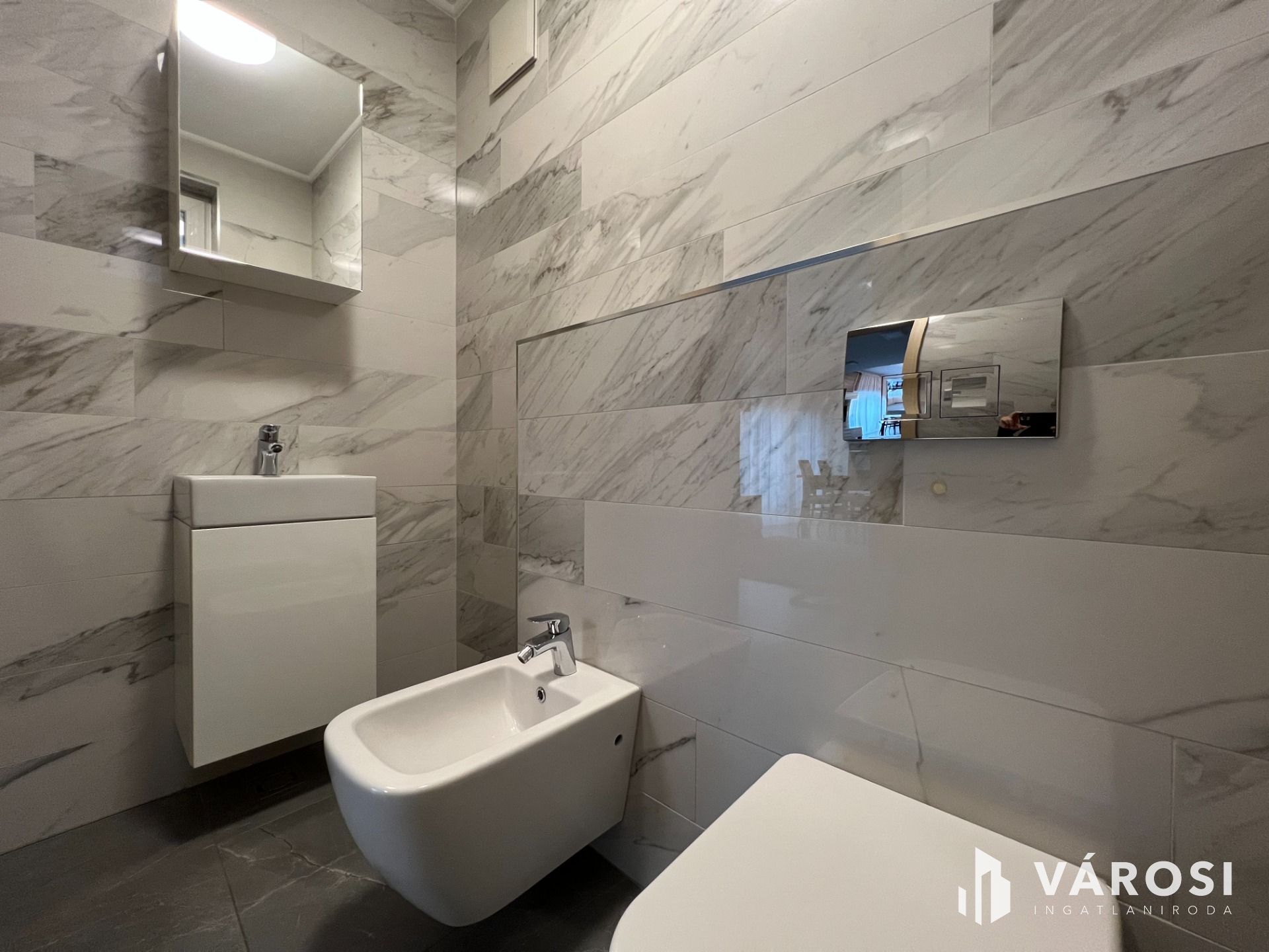 A földszinten található egy minden igényt kielégítő amerikai konyhás nappali, egy tágas kádas fürdőszoba wc-vel, gardrób, külön wc-bidé, közlekedő-mély pakolható gardrób szekrényekkel, továbbá egy világos modern hálószoba.