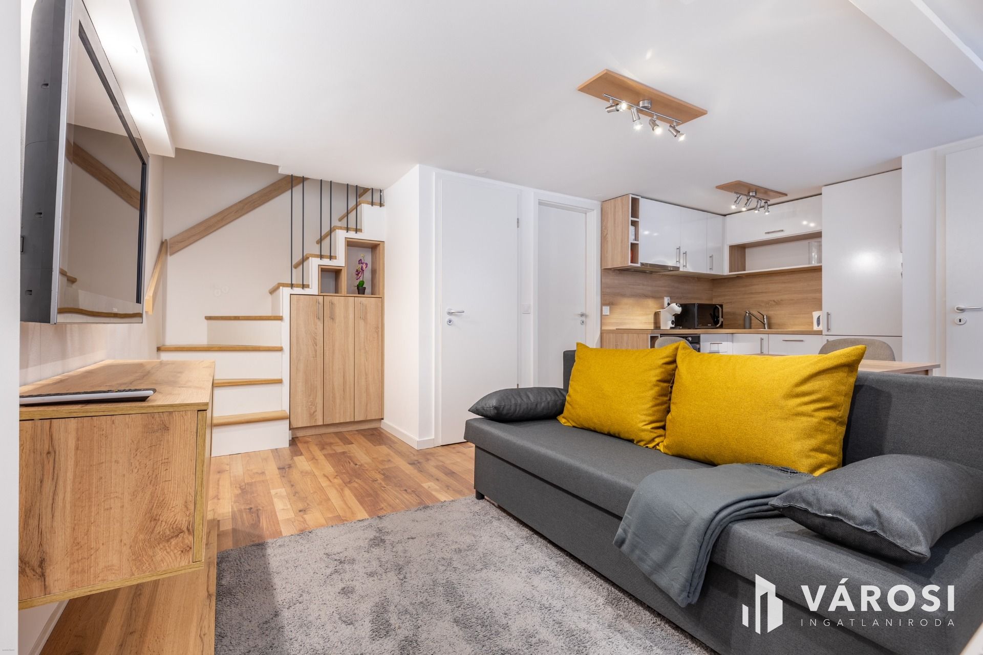 - szintén amerikai konyhás nappali + fürdő + gardrób,
