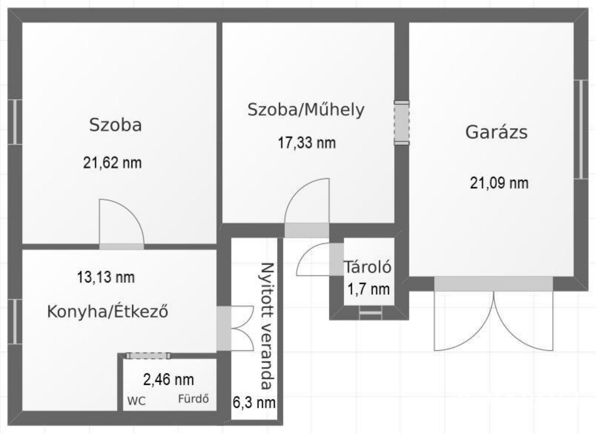 A ház hasznos alapterülete 77 m², ami egy szobából, konyhából, fürdő és WC egyben, valamint egy műhelyből és egy garázsból áll, amely kiválóan alkalmas egy kis család számára, falazata vegyes. A műhely akár egy szoba kialakítására is alkalmas és egybe lehet nyitni a lakrésszel, de jelenleg innét szabad átjárás van a garázsba. A garázs lehetőség további kényelmet nyújt, hiszen biztonságban tudhatja autóját, valamint méretéből adódóan nem csak egy személyautó befogadására képes, hanem traktorral vagy teherautóval is lehet benne parkolni, ezért egy vállalkozás telephelyének is megfelelő az ingatlan. A ház jelenleg felújítás alatt áll a villany- és vízvezetékek cseréje megtörtént. Az ingatlant még vonzóbbá teszi az új villamoshálózat, ami biztosítja a stabil áramellátást, valamint a háromfázisú áram, amely lehetőséget ad akár ipari gépek használatára is. A fagerendás födém hungarocell szigetelést kapott, a fűtés kályhával megoldott.