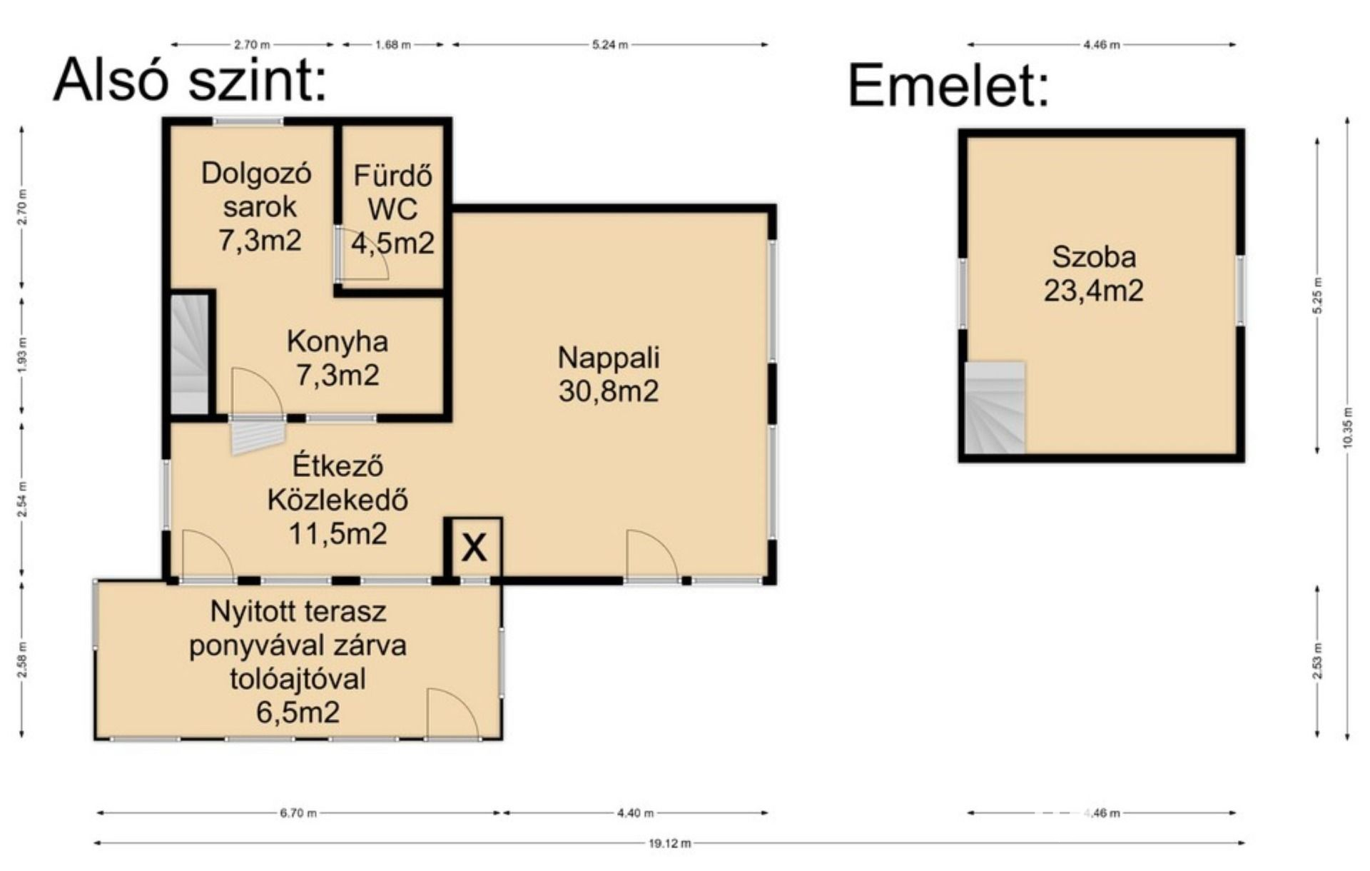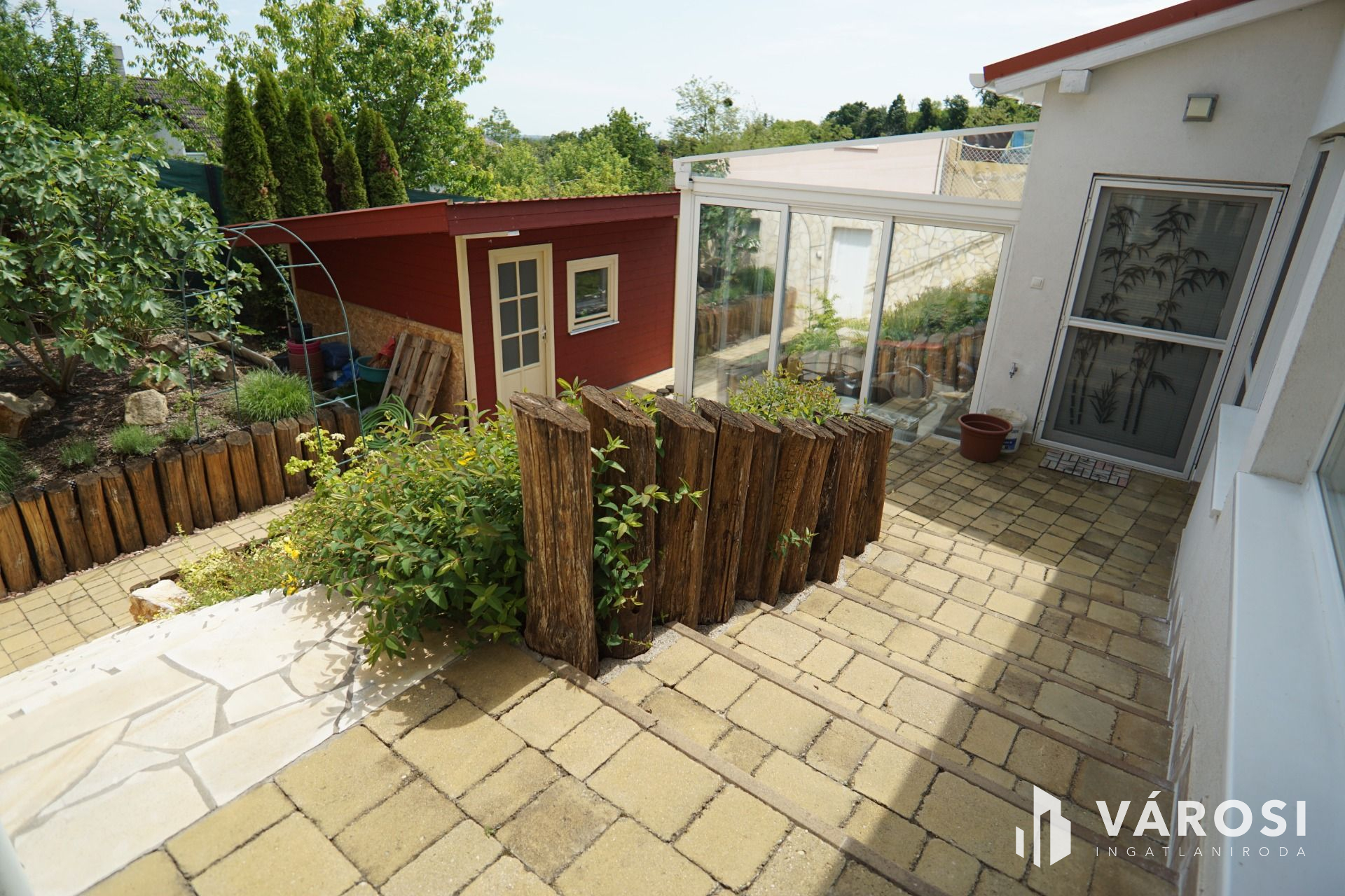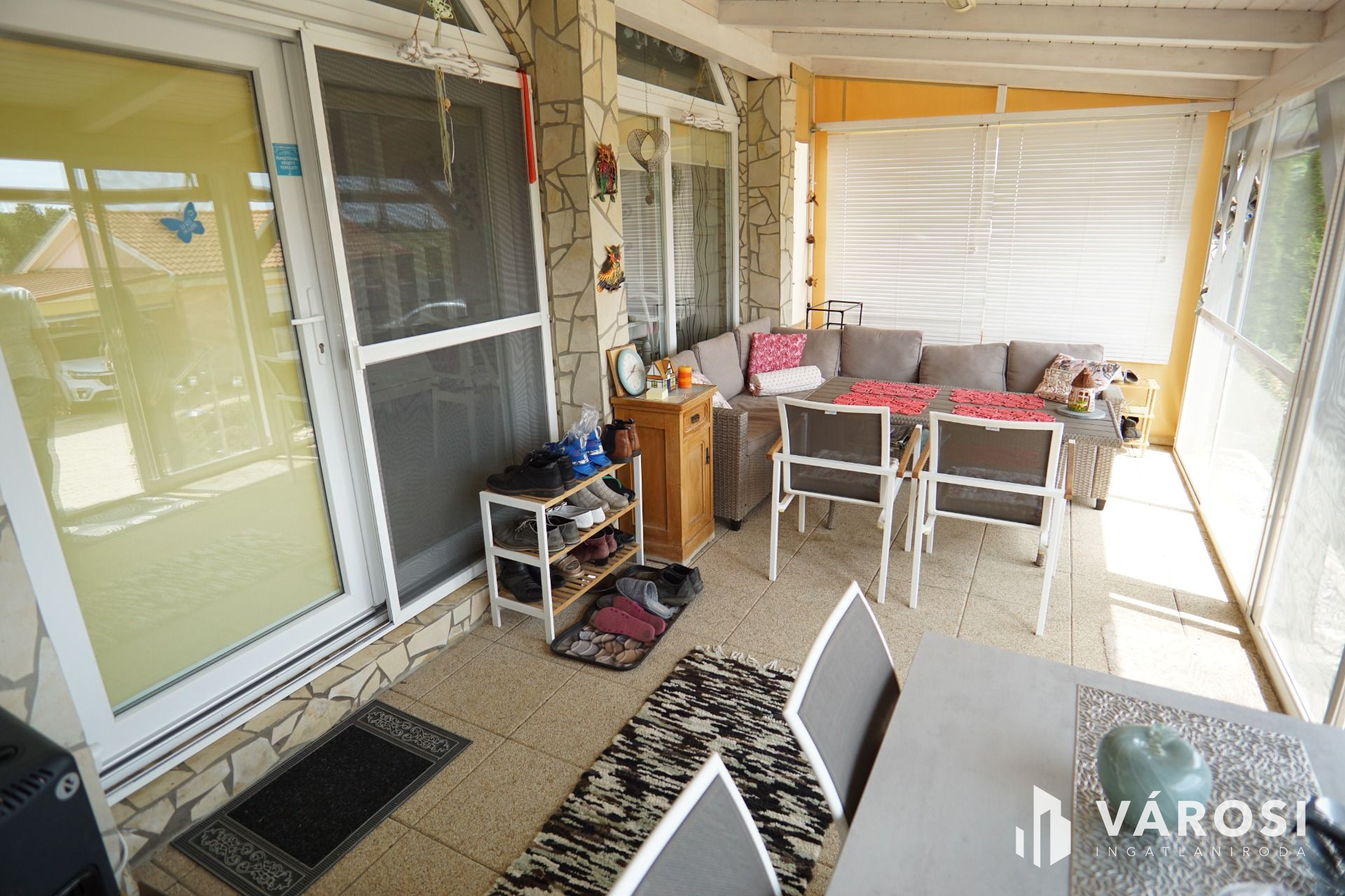 A mediterrán térkővel ellátott udvarról egy lépcsőn keresztül lépünk be egy nagy négyzetméterű teraszra. (ponyvával, szúnyoghálóval felszerelve) Ezen helységből tovább haladva található egy közlekedő és egy étkező , ahonnan közvetlen konyha és teraszkapcsolattal találkozunk. Az épület hátsó szegmensébe található egy dolgozósarok, valamint a fürdő mellékhelységgel együtt. A tetőér beépítésre került ahol található egy nagy hálószoba sok pakolási lehetőséggel.