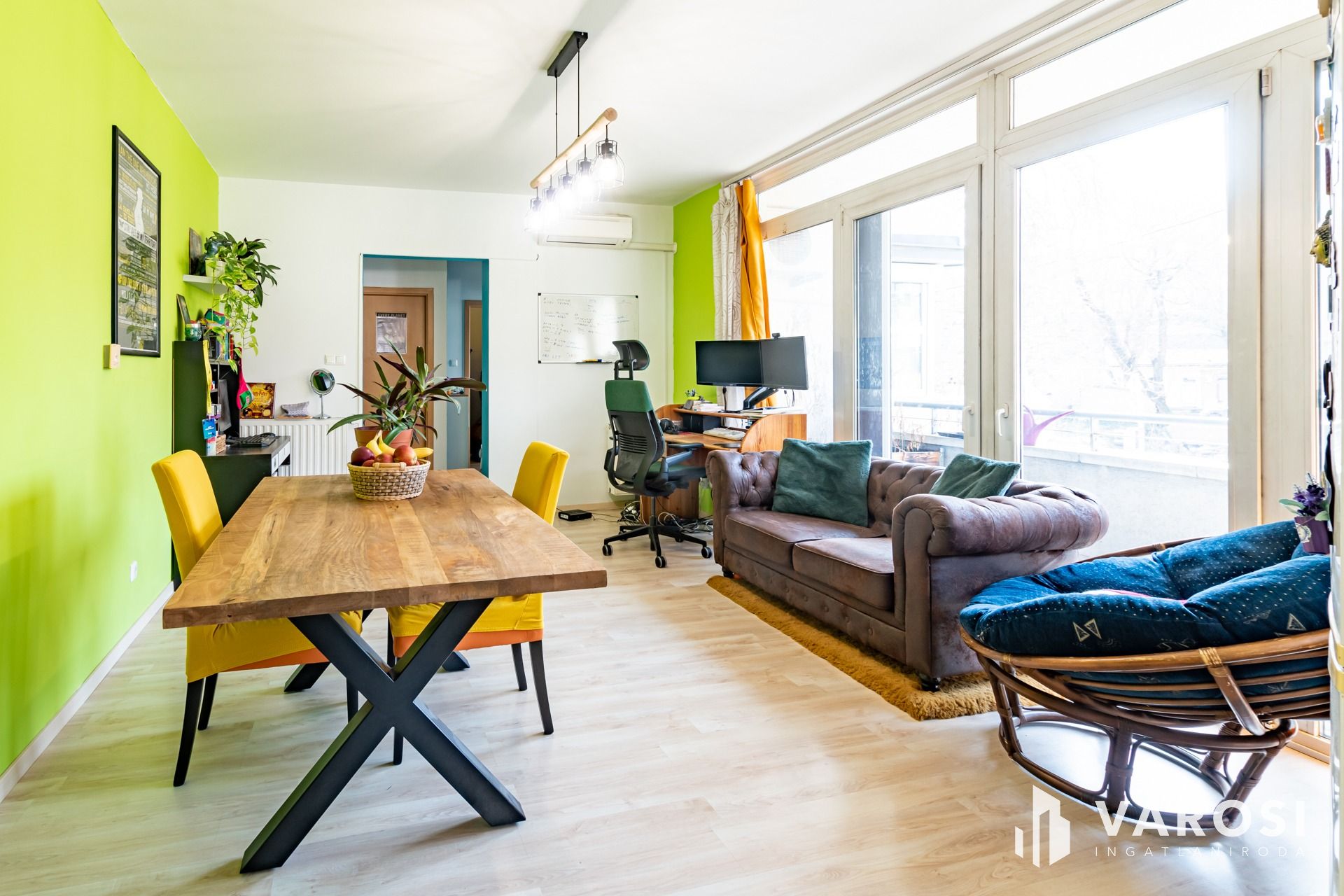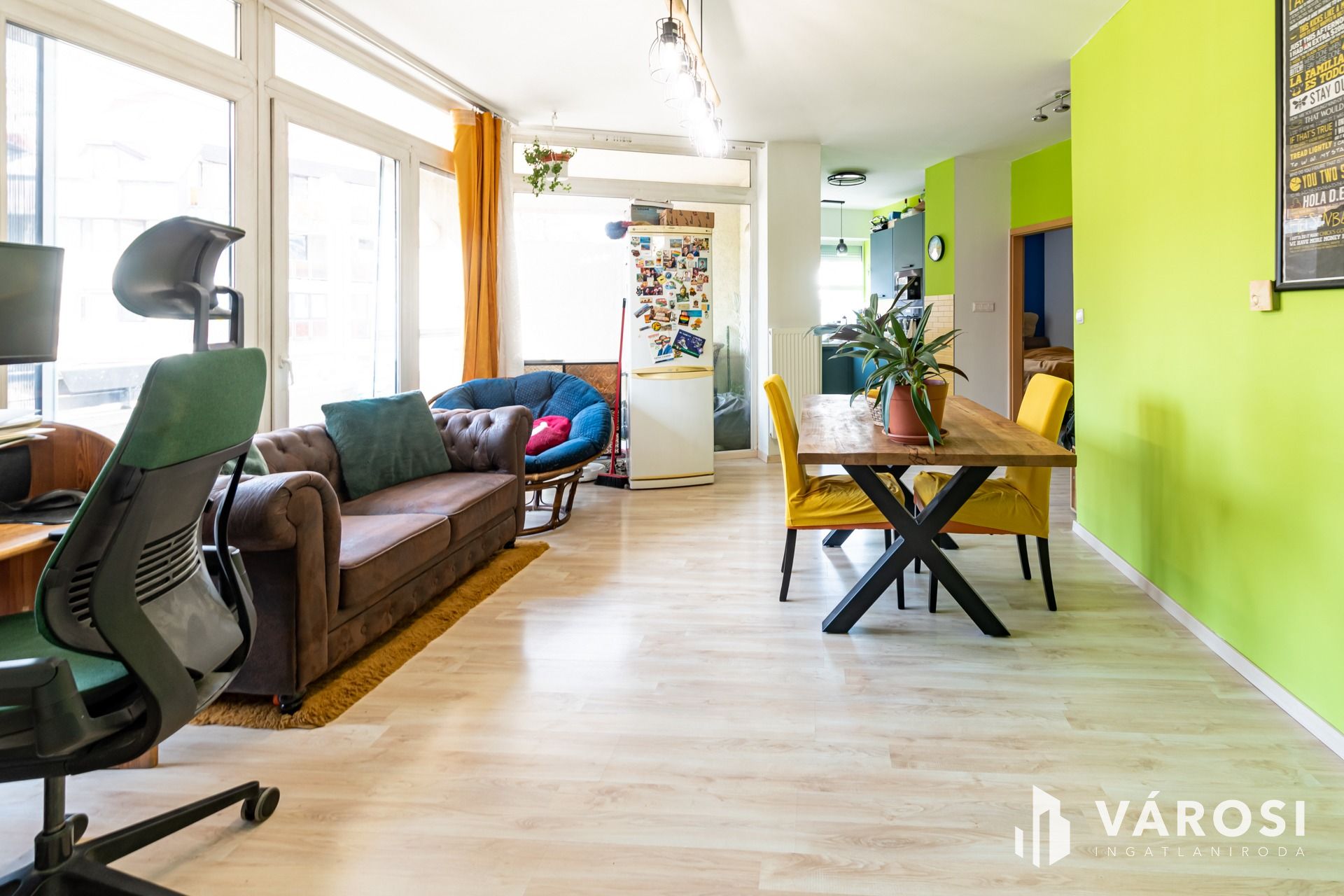 Az ingatlan elrendezése praktikus és jól bútorozható: nappali–étkező + 3 félszoba, így ideális lehet családnak, home office-ra, vagy akár befektetésnek/kiadásra is. A lakás déli tájolású, utcai kilátású, és egy 8 m²-es erkély is tartozik hozzá.