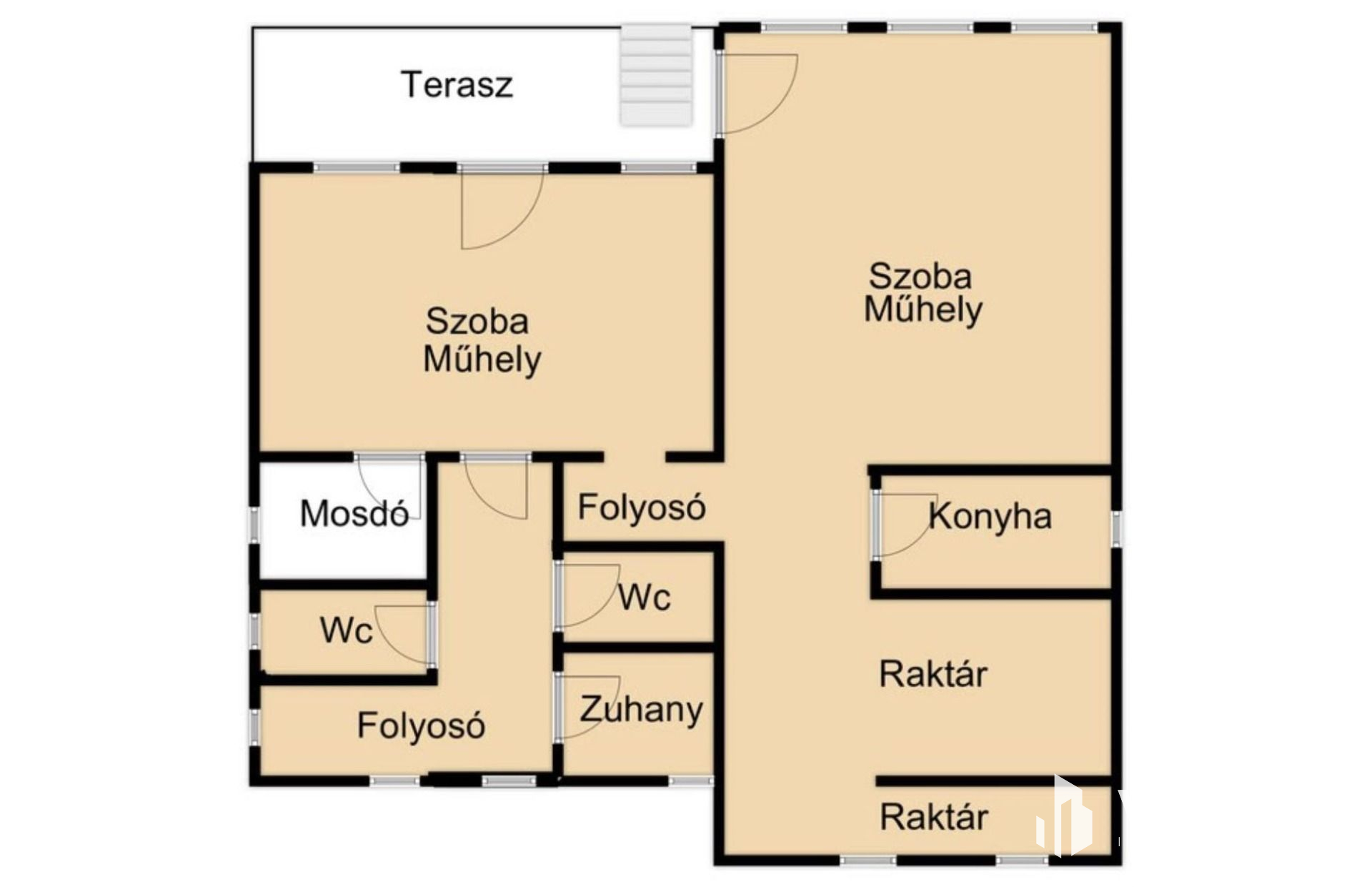 Jelenleg üveges műhelyként funkcionál, a felső szint beépíthető, amit már elkezdtek beépíteni.