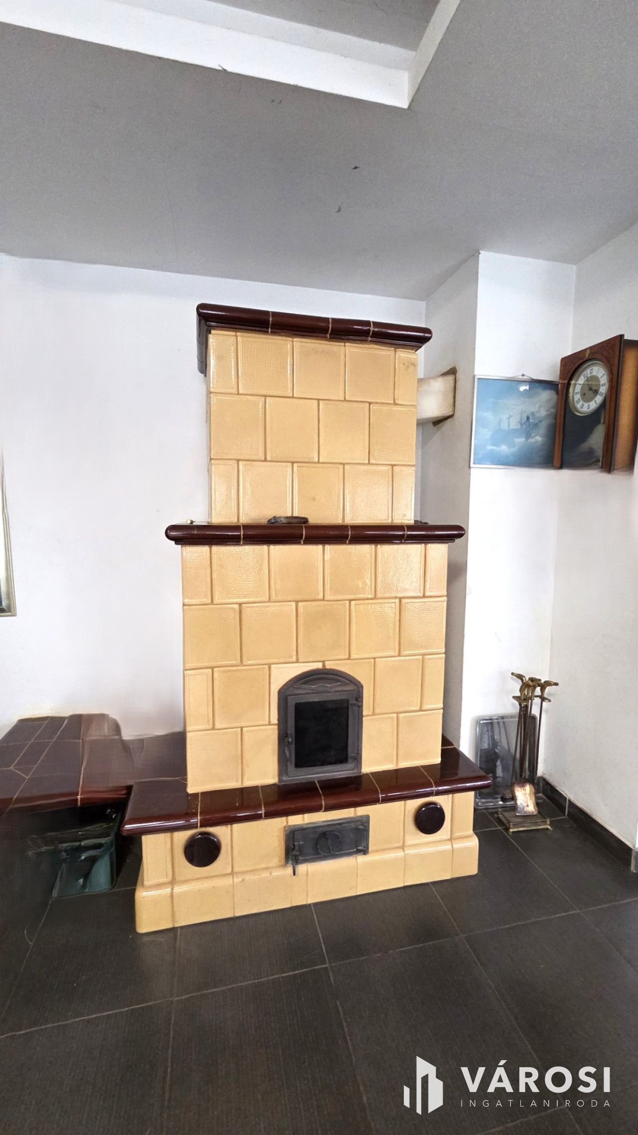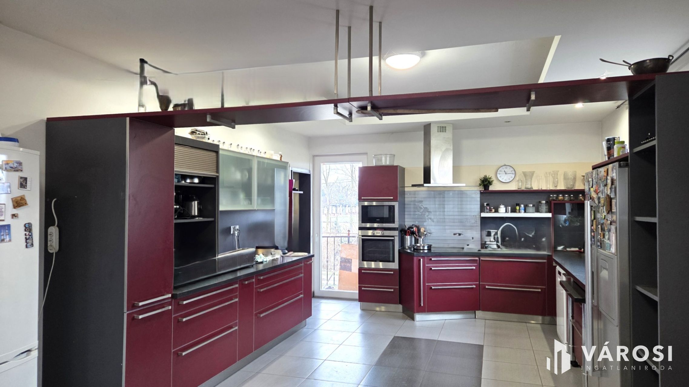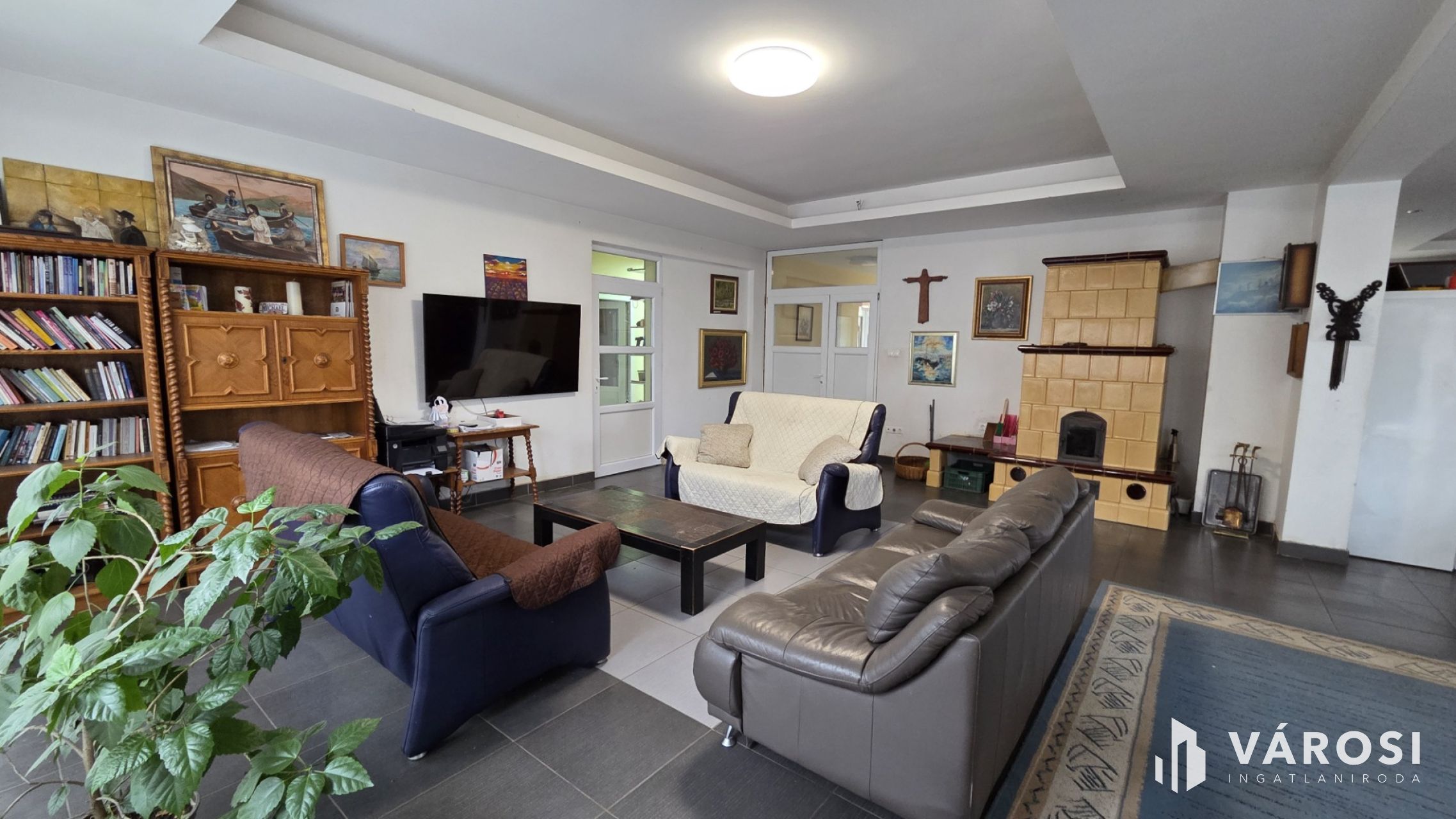 A ház szíve egy 92 m²-es amerikai konyhás nappali, hatalmas üvegfelületekkel, ahonnan a kert látványa tárul elénk. A nappaliban egy gyönyörű cserépkályha ad meghitt hangulatot – igazi közösségi tér, ahol a család apraja-nagyja könnyen együtt lehet.