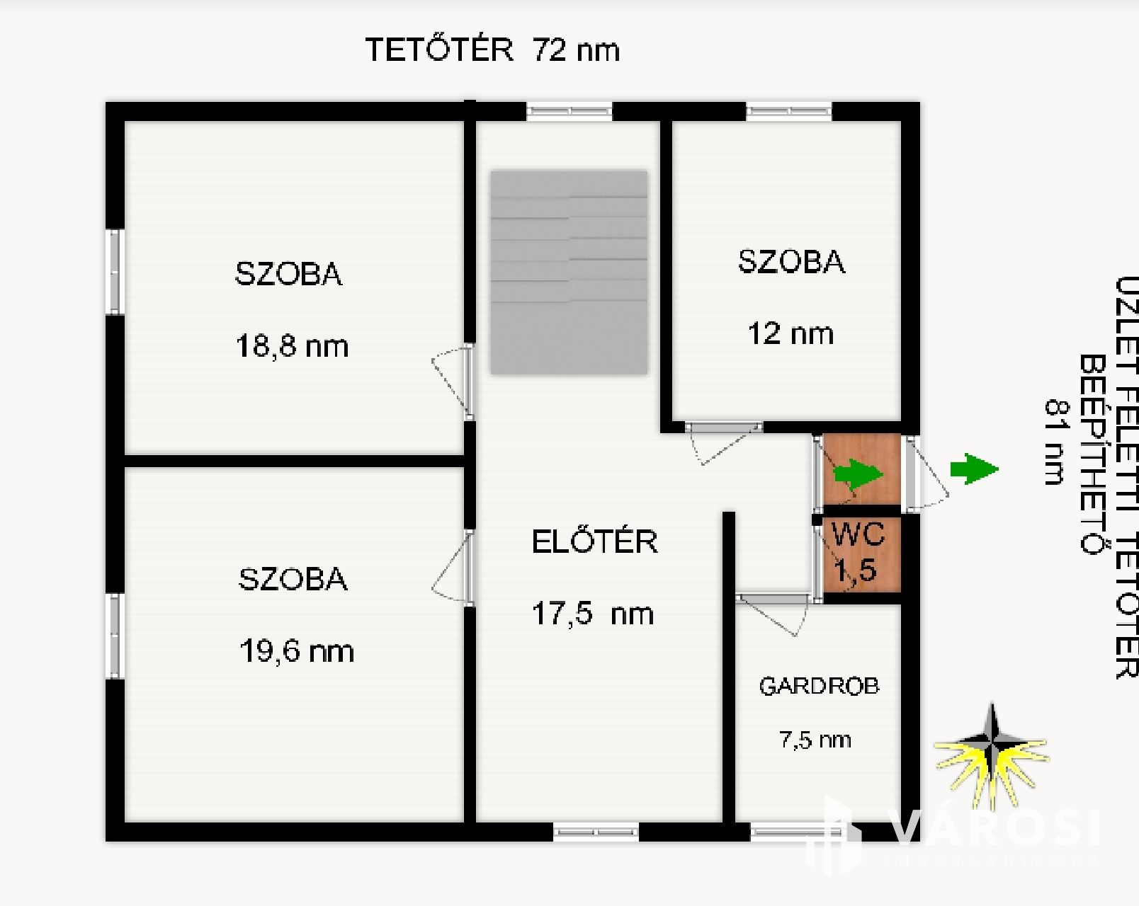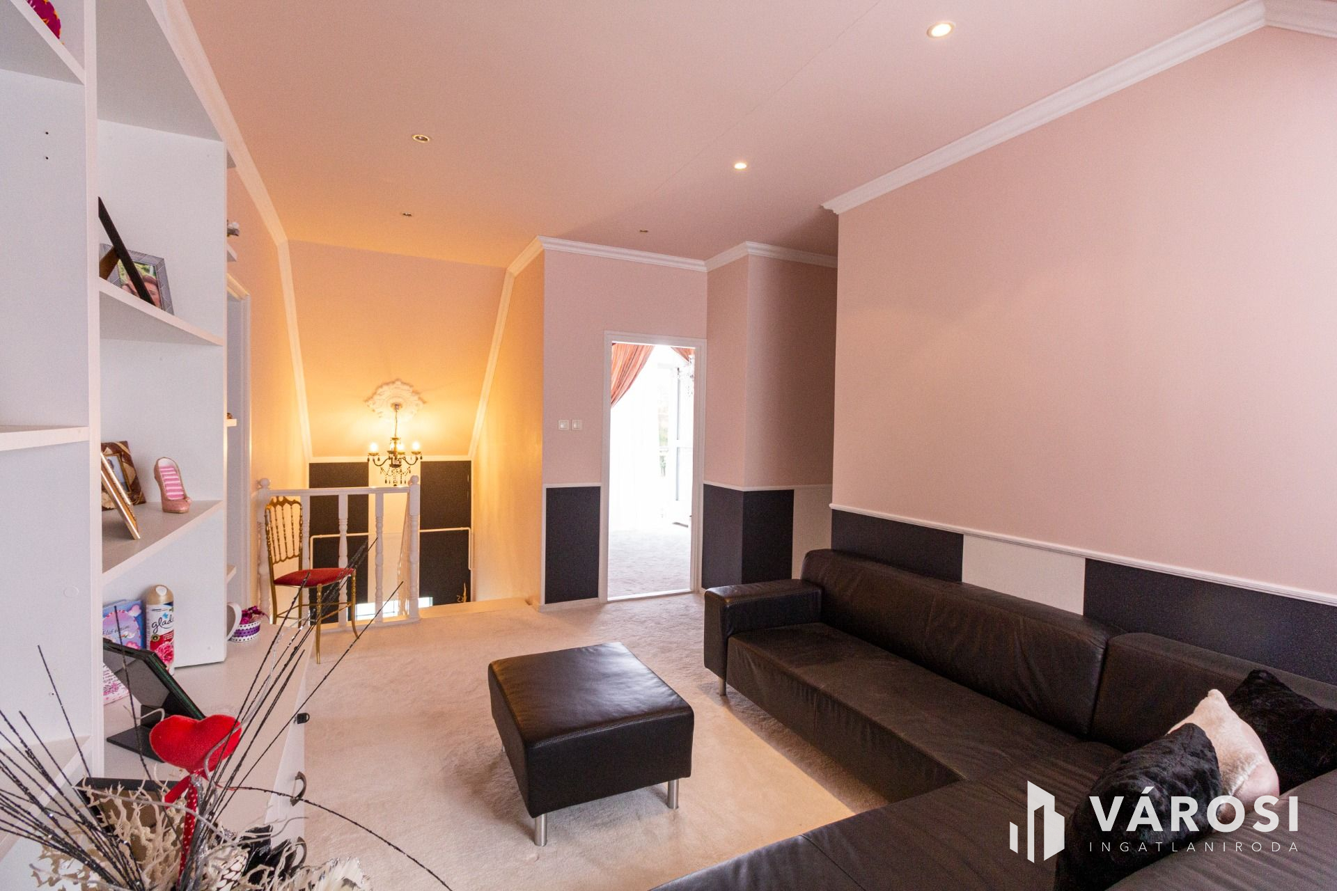 Az emeletre felérve egy társalgóba jutunk, innen érhető el a három külön bejáratú szoba, a gardrób és egy emeleti WC.