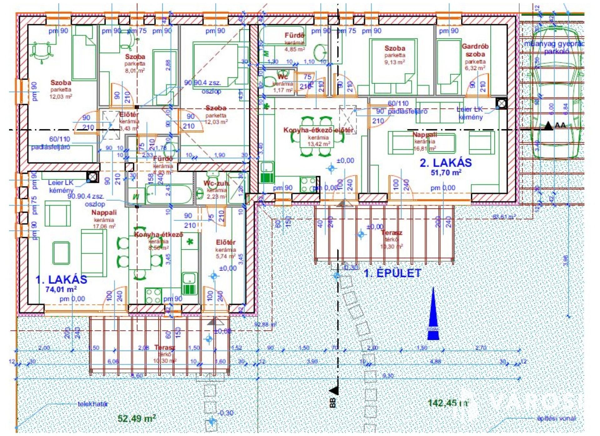 - A gépkocsi beállókhoz, illetve a teraszokhoz csatlakozva a két kocsibeállónál