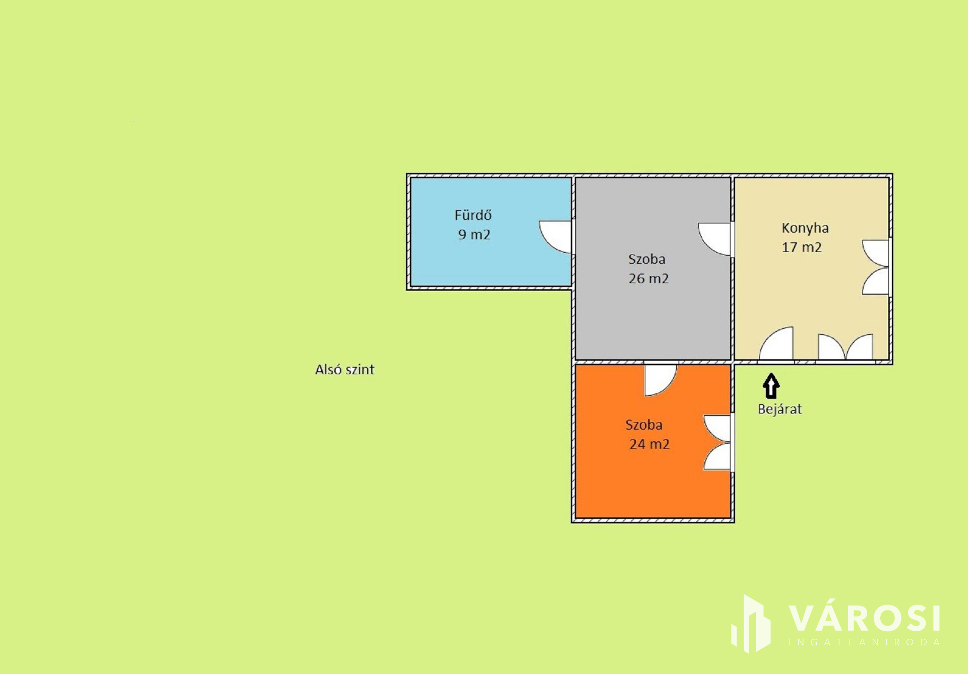 Az ingatlan alsó szintjén kialakításra került két tágas hálószoba, konyha egy légtérben az étkezővel, illetve egy fürdőszoba együtt a WC-vel.