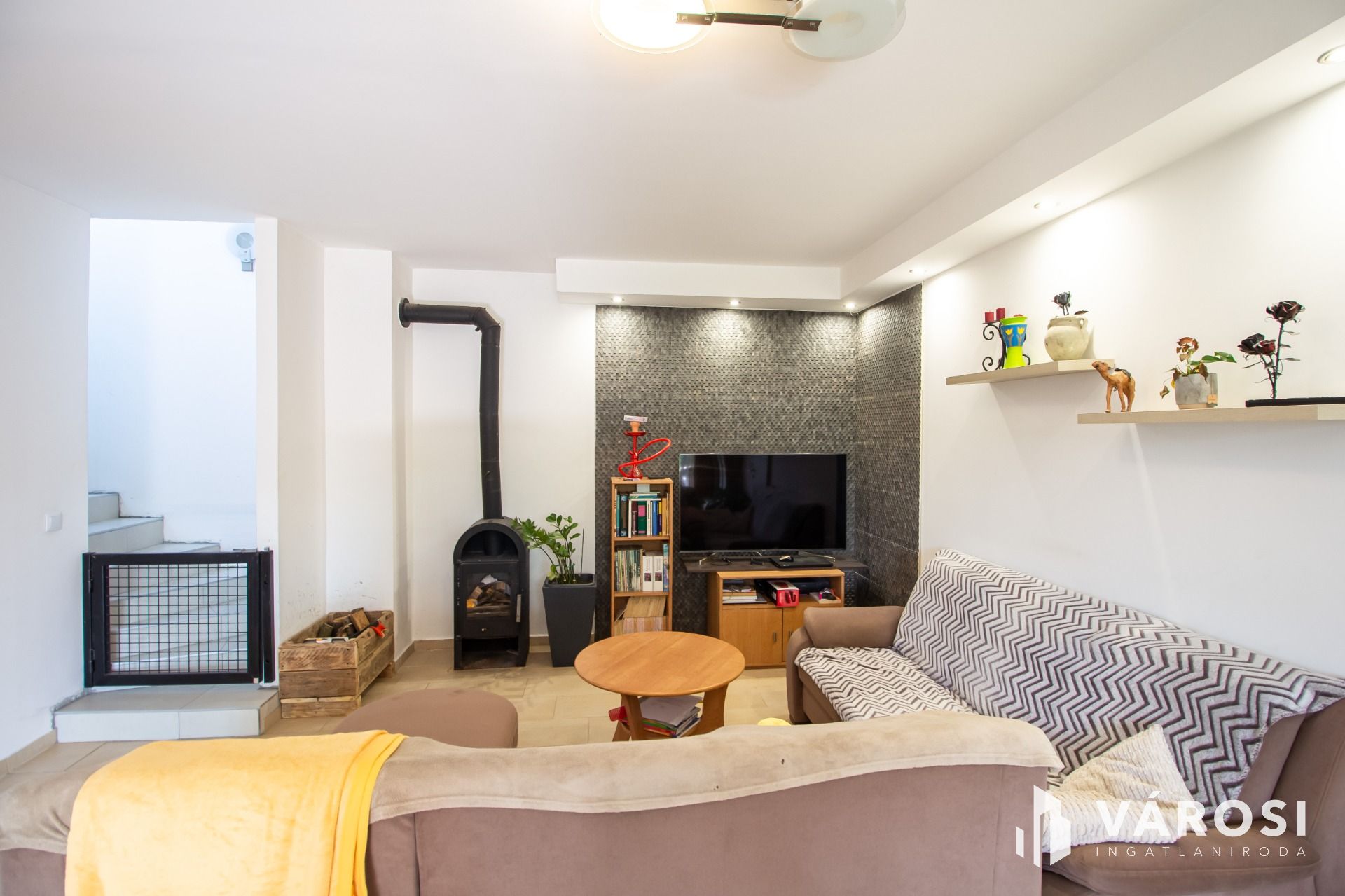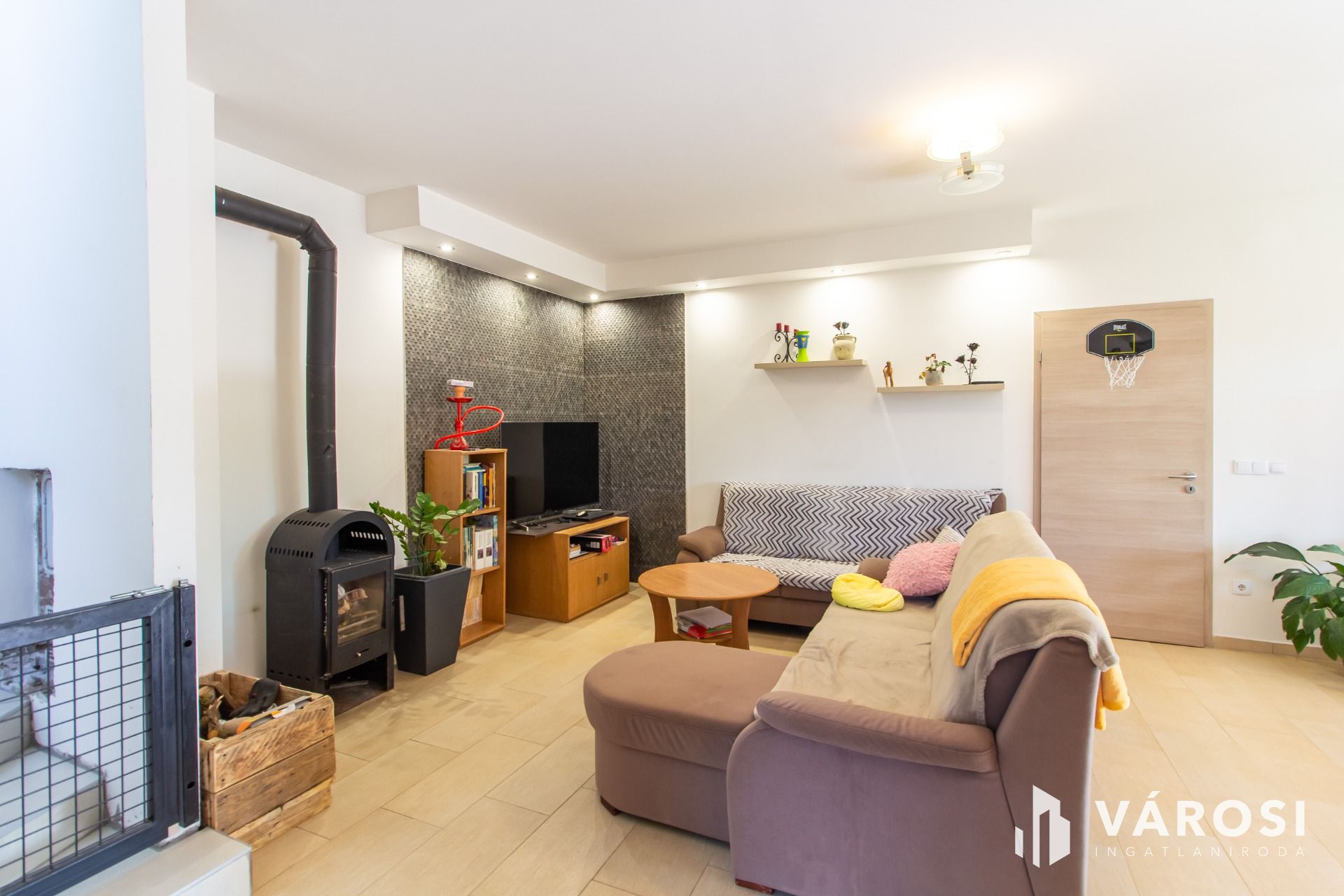 A nappaliban egy kandalló biztosítja a kellemes hangulatot, de cserépkályha kialakítására is van lehetőség. A ház kényelmi funkciókkal is rendelkezik: elektromos redőnyökkel és szúnyoghálóval van felszerelve. Az udvarban egy kétállásos parkoló is kialakításra került, így a parkolás is kényelmes és biztonságos.