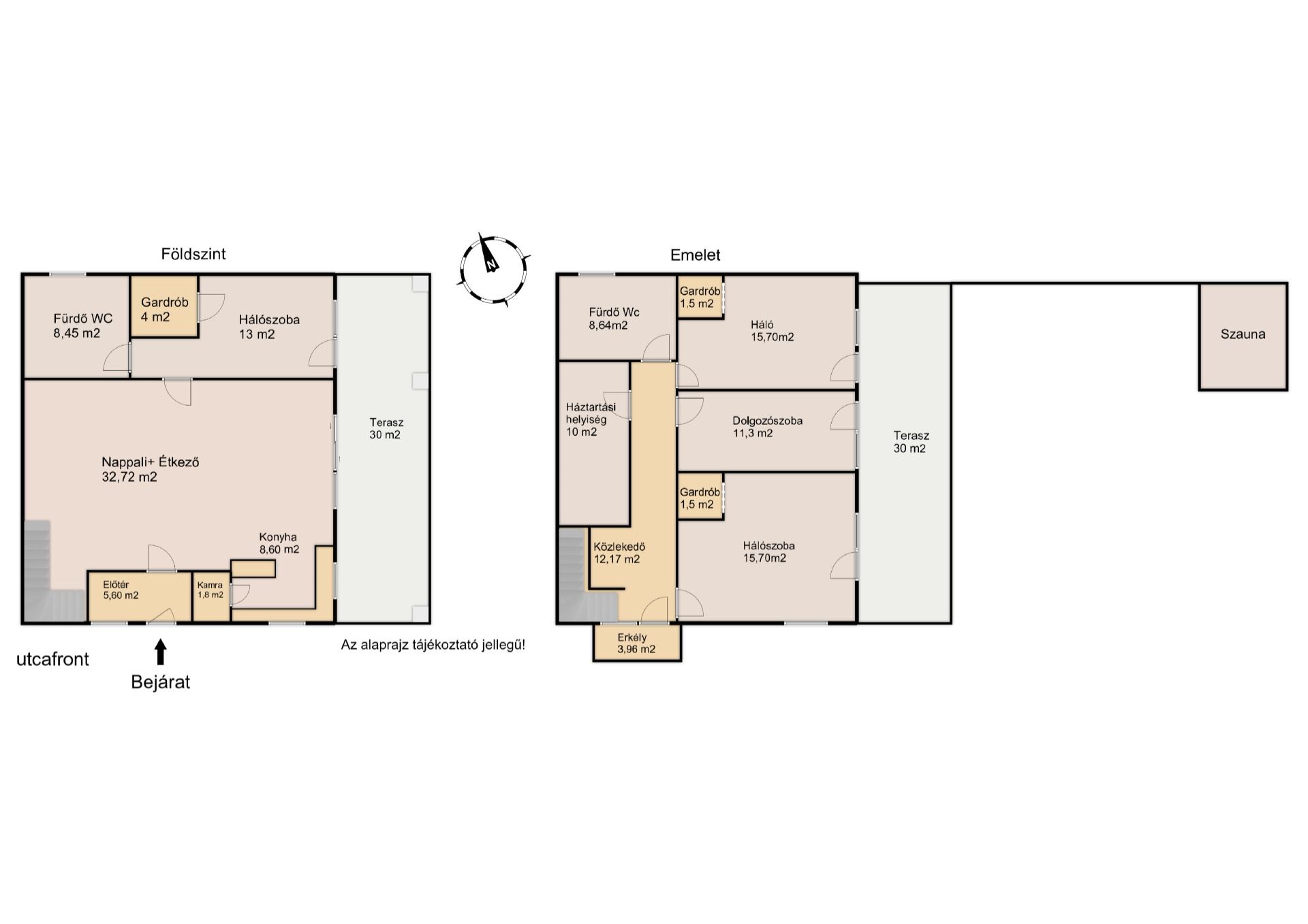 Az emeleti szinten további 2 hálószoba, egy dolgozószoba, háztartási helyiség, valamint egy második fürdőszoba található.