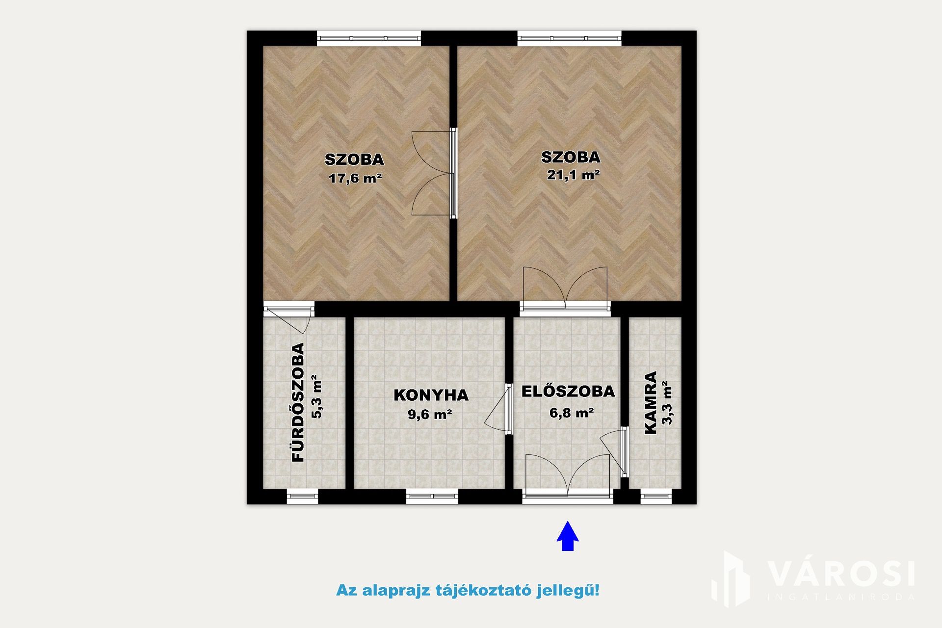 A szobák csaphornyos parkettával, az előszoba, a konyha, a fürdőszoba járólappal borított.