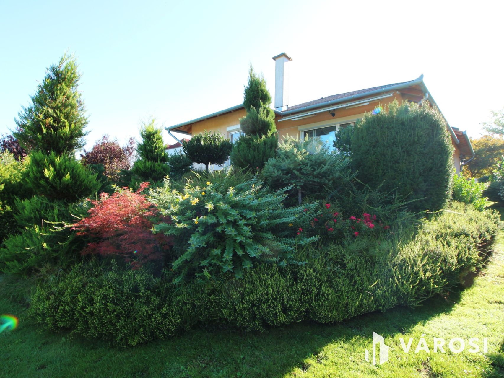 A kilátás bármelyik évszakban tökéletes. A parkosított udvar igazi oázis, ahol a változatos ,sokszínű növényzet mellett két kerti tó látványa fogad minket. A kert és a tó gondozásához 7 zónás automata öntözőrendszer és pozitív fúrt kút áll rendelkezésre.