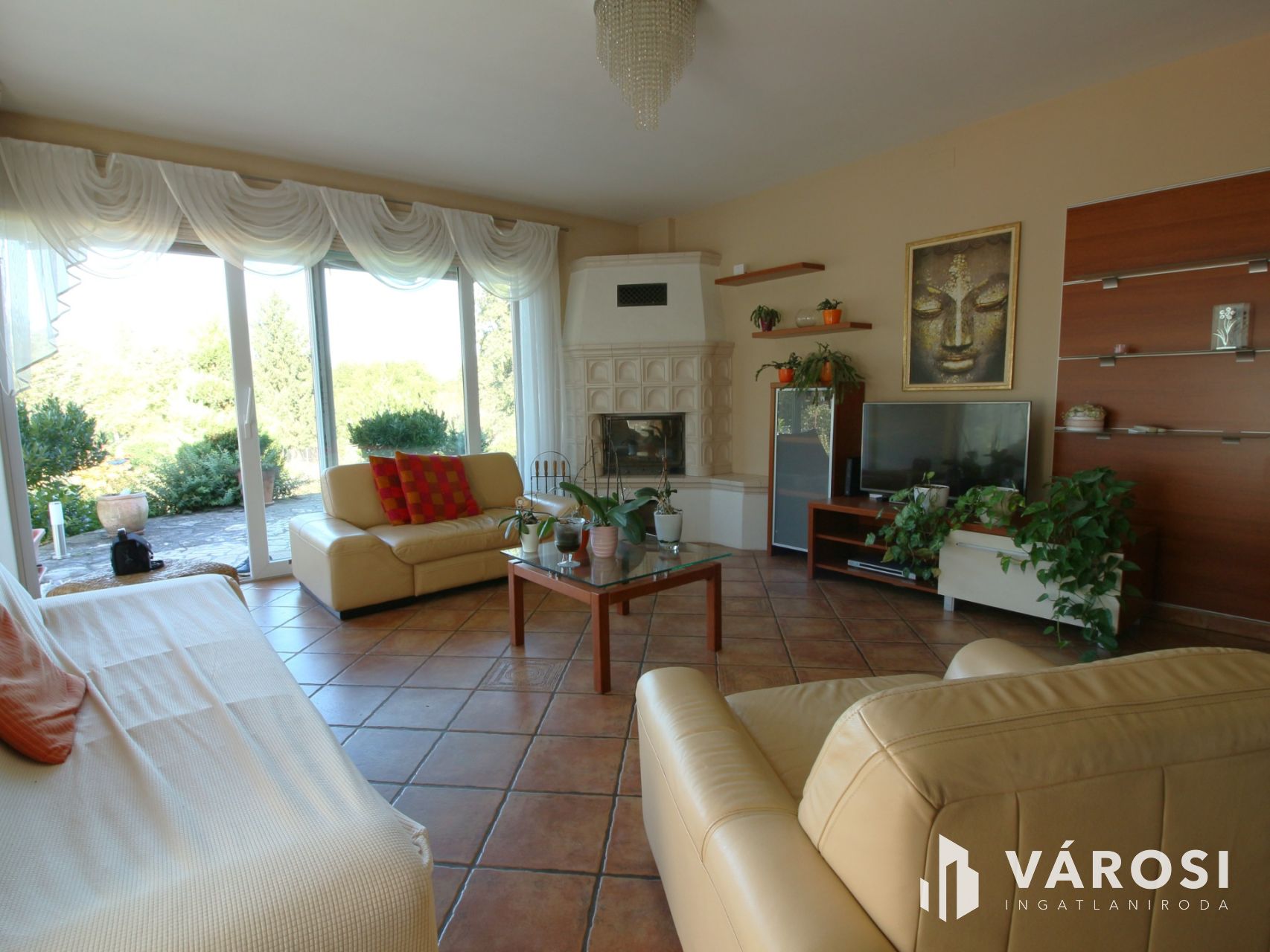 A minden oldalról beáradó fény biztosítja a helyiségek barátságos hangulatát. Ezt még a téli hónapokban fokozza a sarokban elhelyezett kandalló látványa.