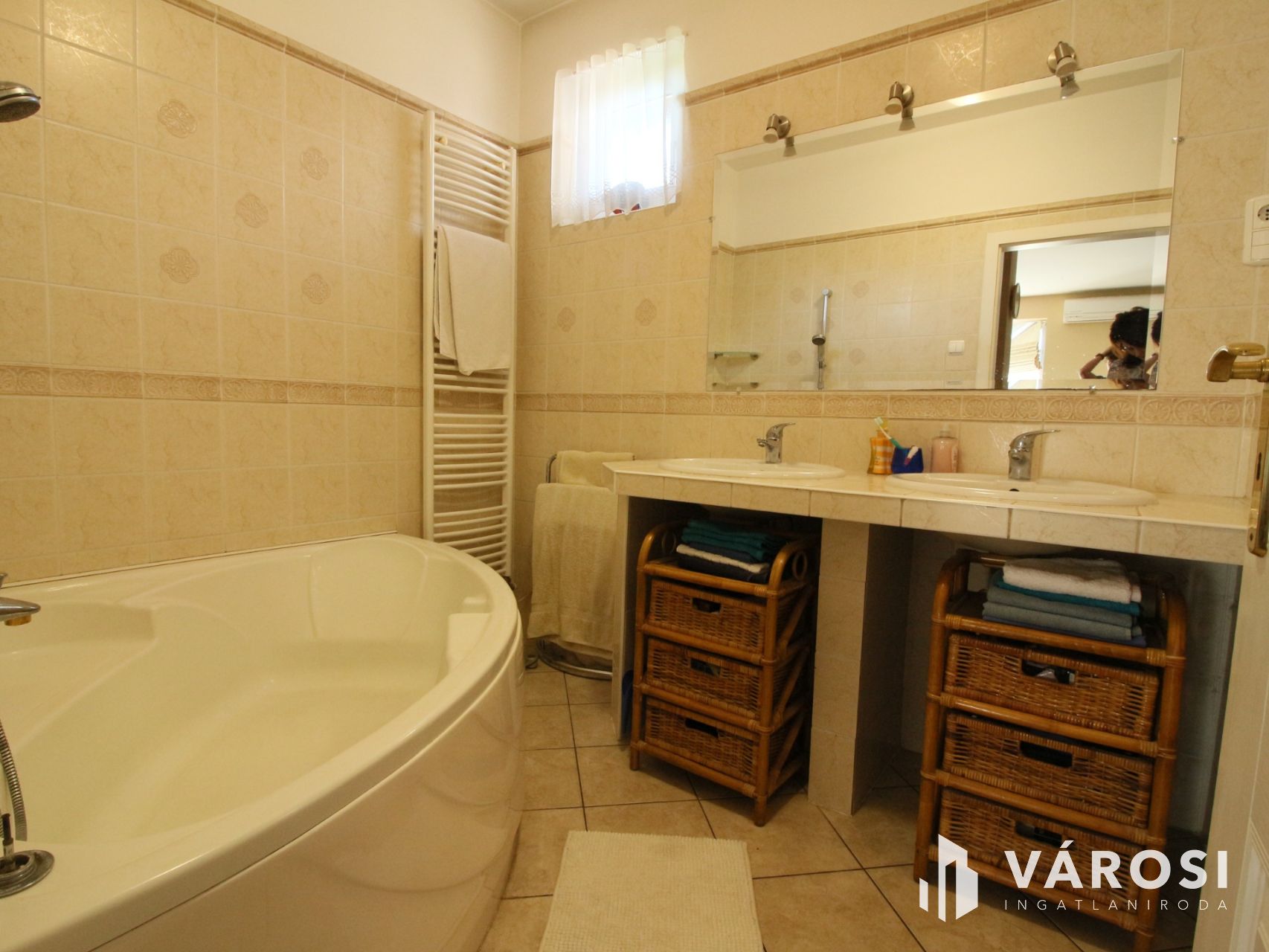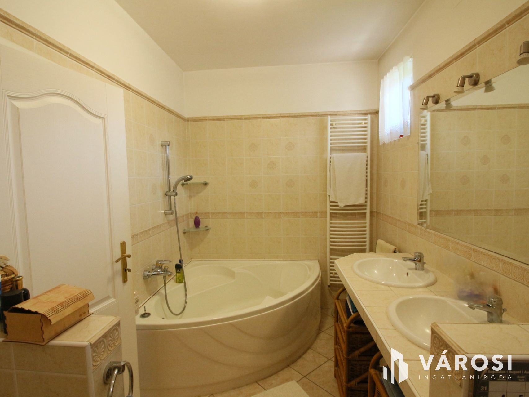 A kényelmes méretű fürdőszoba sarokkáddal,dupla kézmosóval,-wc-vel és bidével teszi komfortossá a mindennapokat!