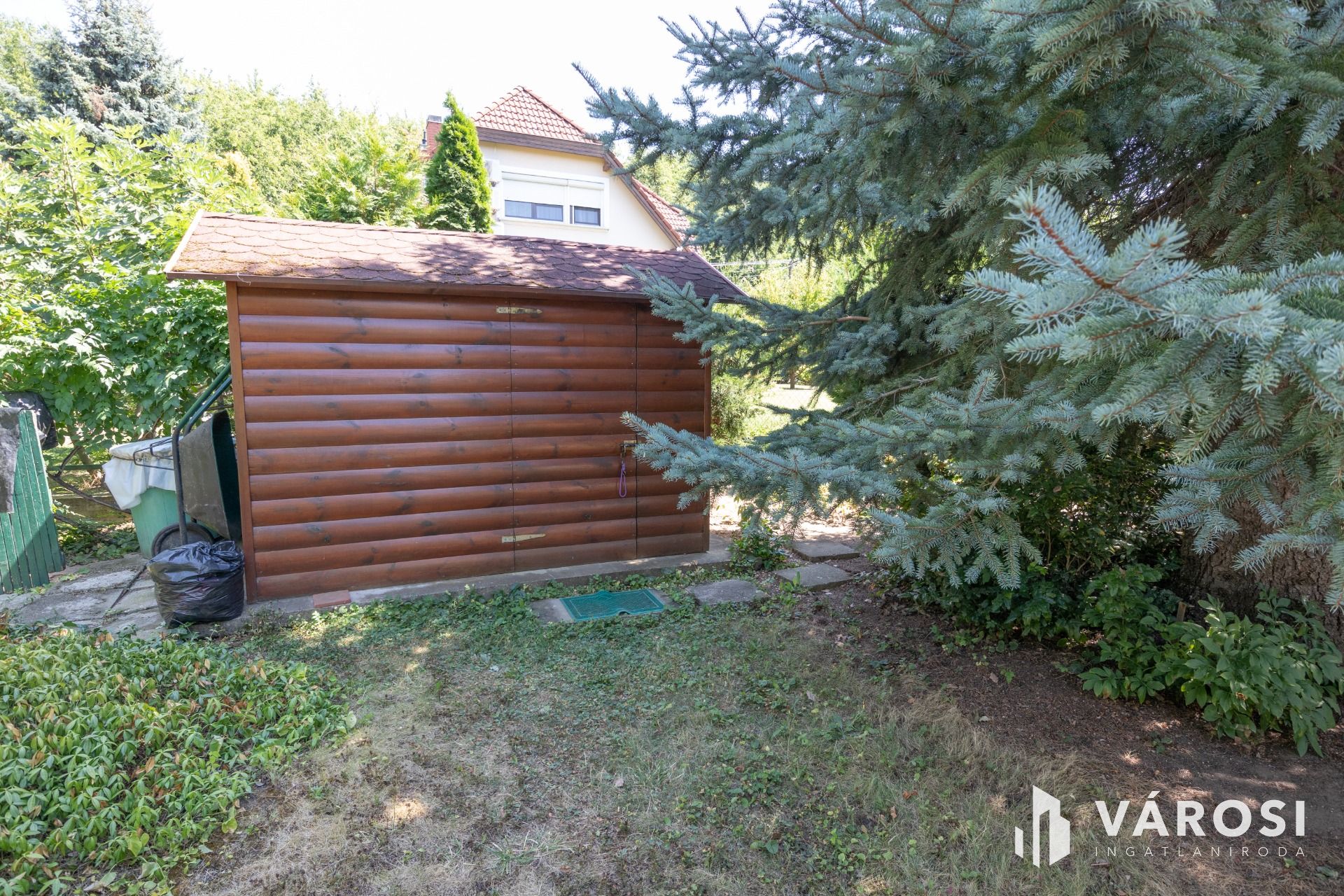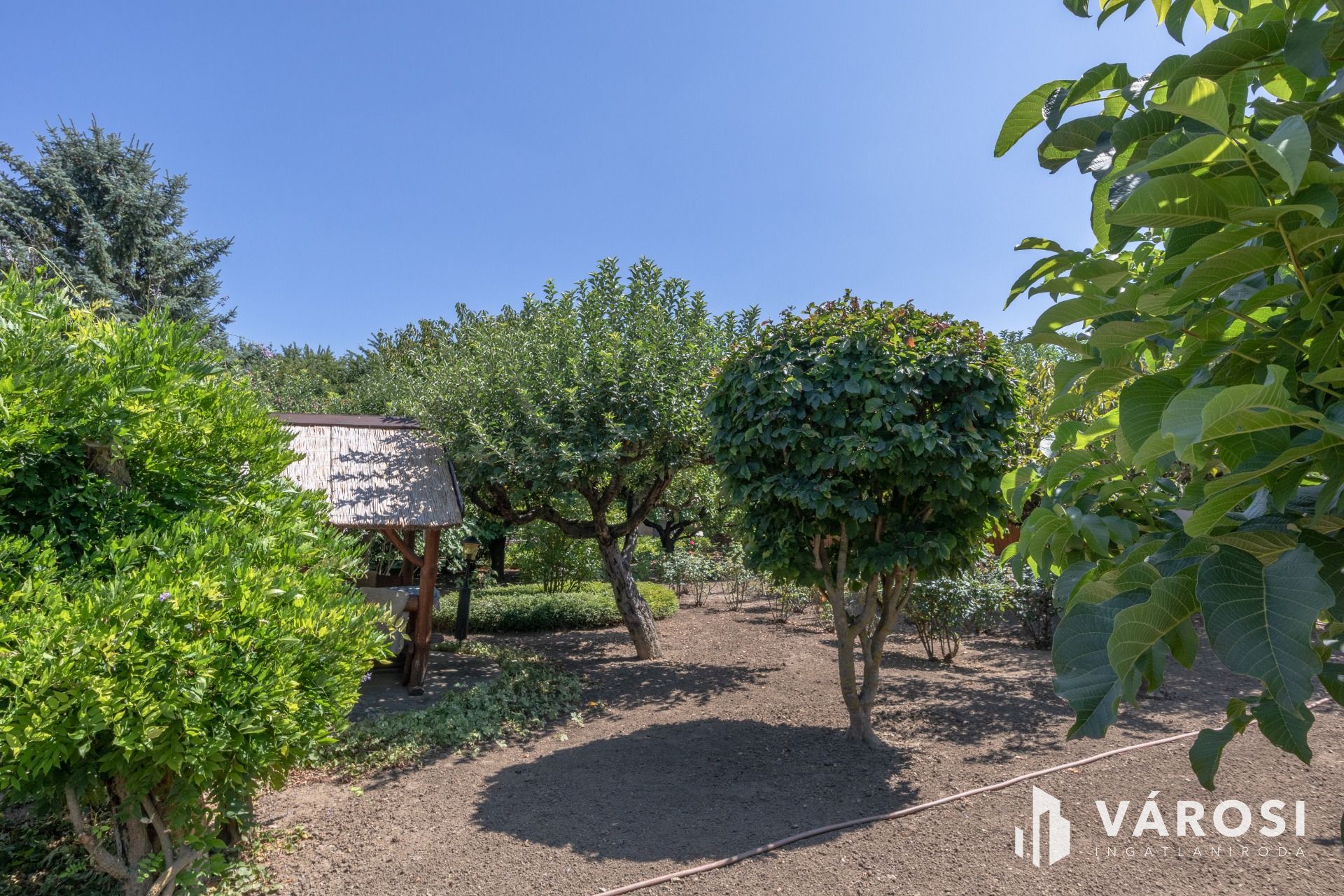 A telken gondozott termő gyümölcsös és dísznövények adnak árnyékot.